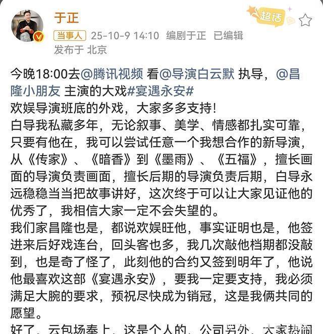 9日,于正发文晒云包场支持《宴遇永安》!并称:“这是个人的,公司另外,大家热闹热闹,开宴!”
